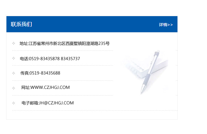 地址:常州市新北區友邦商務大廈1幢16、17層  電話:0519-85101652  傳真:0519-85112595  郵編:213022  網址:www.cz-jiayue_cn.51pandian.com  郵箱:xiajifengaa@163.com
